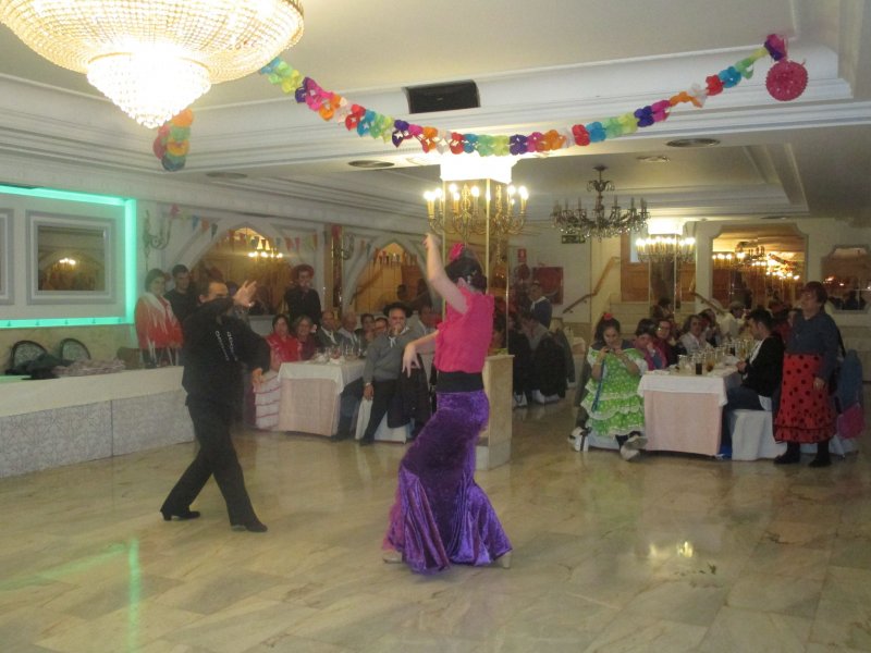 Para hacer hueco para el postre Salones Venecia nos presentó su espectáculo flamenco que nos interpretó unas bonitas sevillanas y rumbas, nuestros chic@s acabaron bailando con los flamencos. Una vez que acabó dicho espectáculo se apagaron las luces y apareció la góndola con dos tartas iluminadas con bengalas y sonando la canción de cumpleaños feliz, pues tres chavales cumplían los años en abril, María, Juan Vi y Jose Antonio, muchas felicidades para ellos. Seguidamente brindamos al ritmo de la traviata. El postre estaba compuesto de tarta selva negra acompañada de helado napolitano y café de Colombia e infusiones.